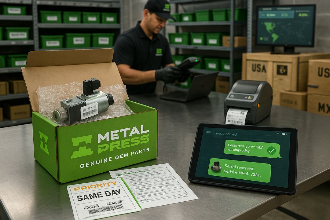 We maintain a deep inventory of spare parts for all MetalPress equipment—ready to ship across the USA, Canada, Mexico, and South America.